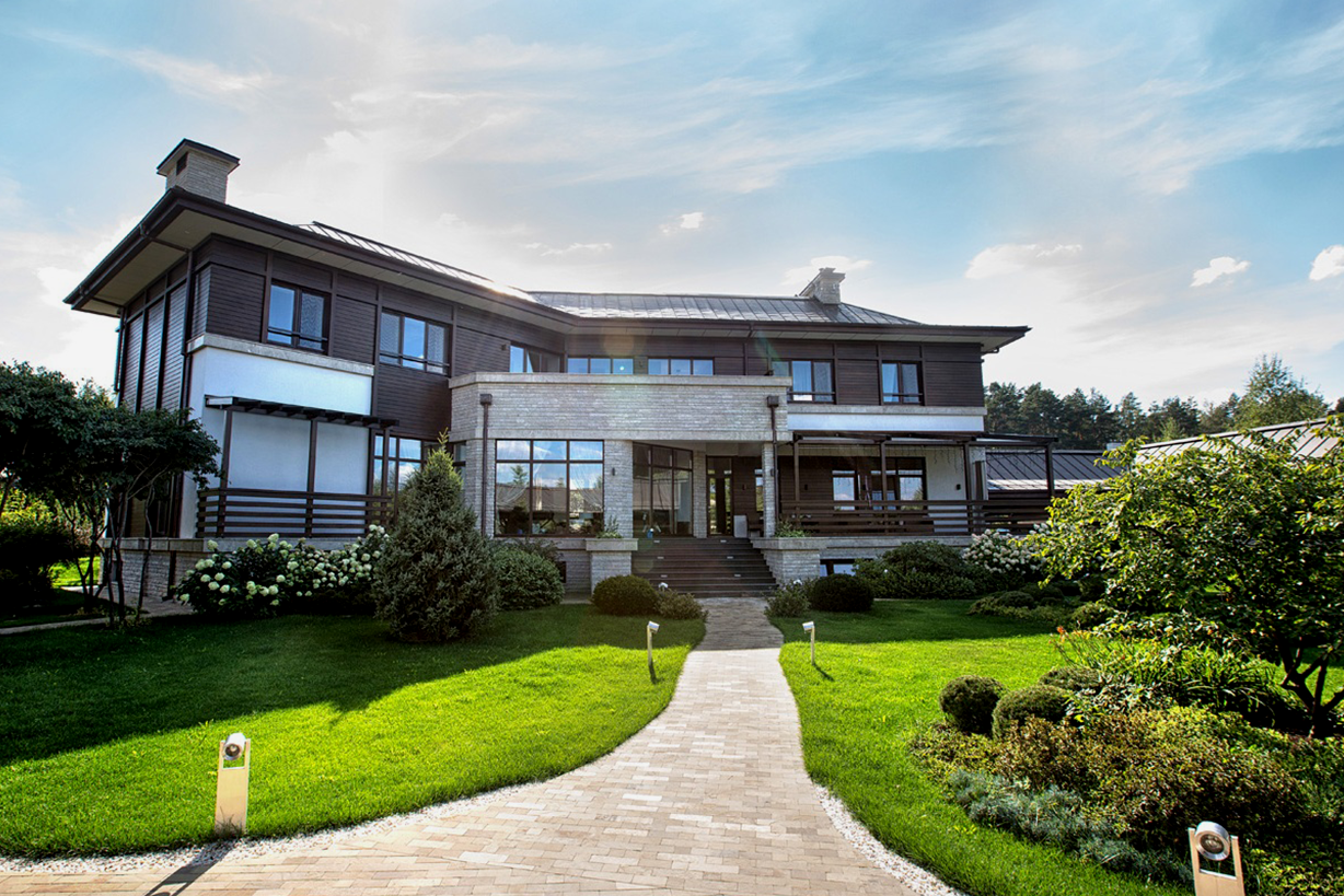 Частный дом в стиле «Райт» в Московской области. Дом построен из высококачественных материалов. В отделке фасада использованы: медь, натуральное дерево, натуралный камень.