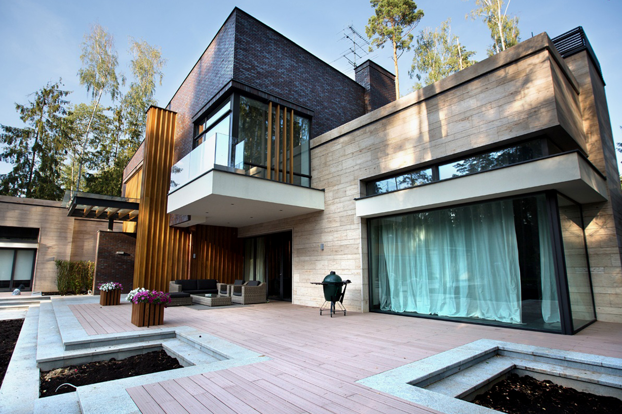 Частный дом с бассейном в Московской области в современном стиле. При строительстве данного дома очень важно было сохранить идею минимализма и четкости линий. Использовались такие материалы как: натуральный камень (мрамор), натуральное дерево, клинкерный кирпич. Террасы отделаны полимерным материалом-деккинг, который является особо износо- и морозостойким.